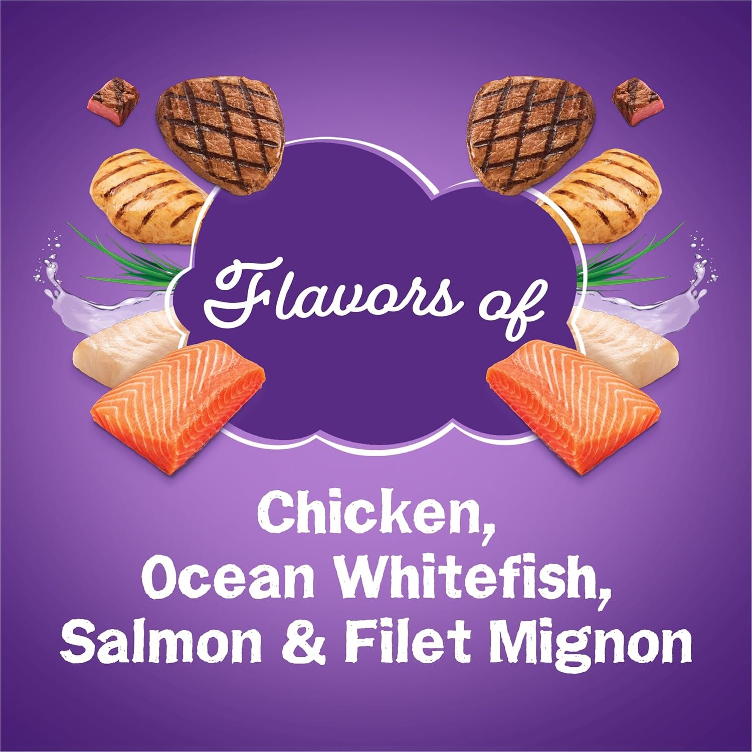 Flavours of Chicken. Ocean Whitefish. Zalm en filet mignon. Eigenlijke vormen houden je kat opgewonden tijdens de maaltijd