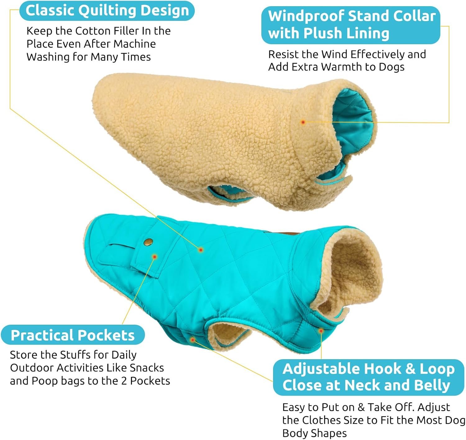 Queenmore Warm Dog Coat, Cold Weather Puffer Hond Vest, Quilt Winter Jacket Ultra Dikke pluche fleece voering huisdierkleding met opbergzakken (lichtblauw, klein)