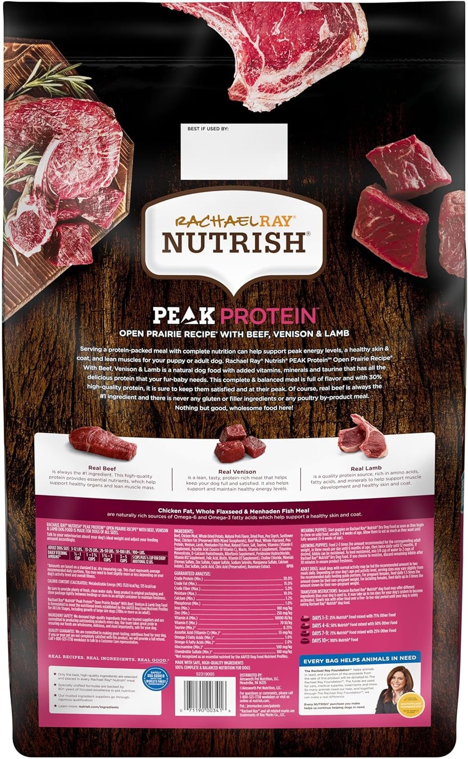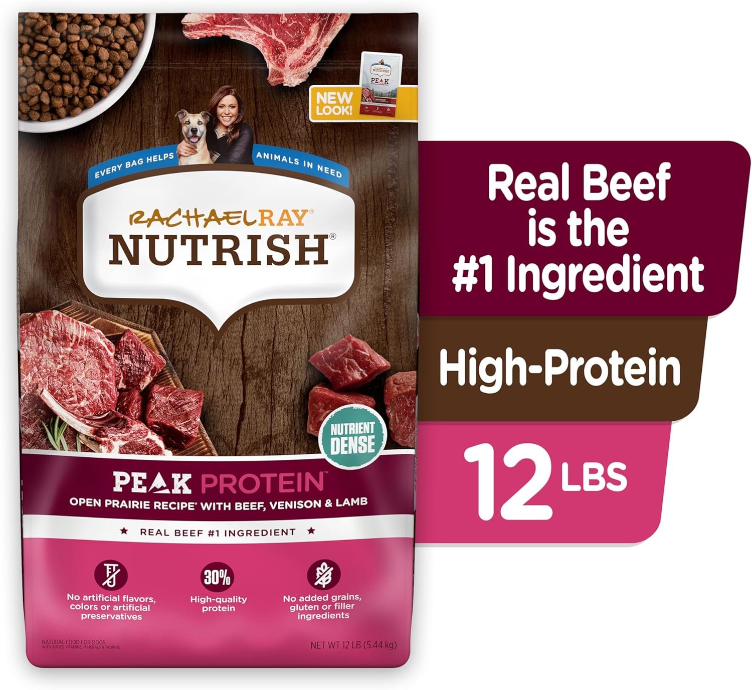 Rachael Ray Nutrish Peak Natural Dry Dog Food, Open Prairie Recept met rundvlees, herten en lam, 12 pond, graanvrij (verpakking kan variëren)