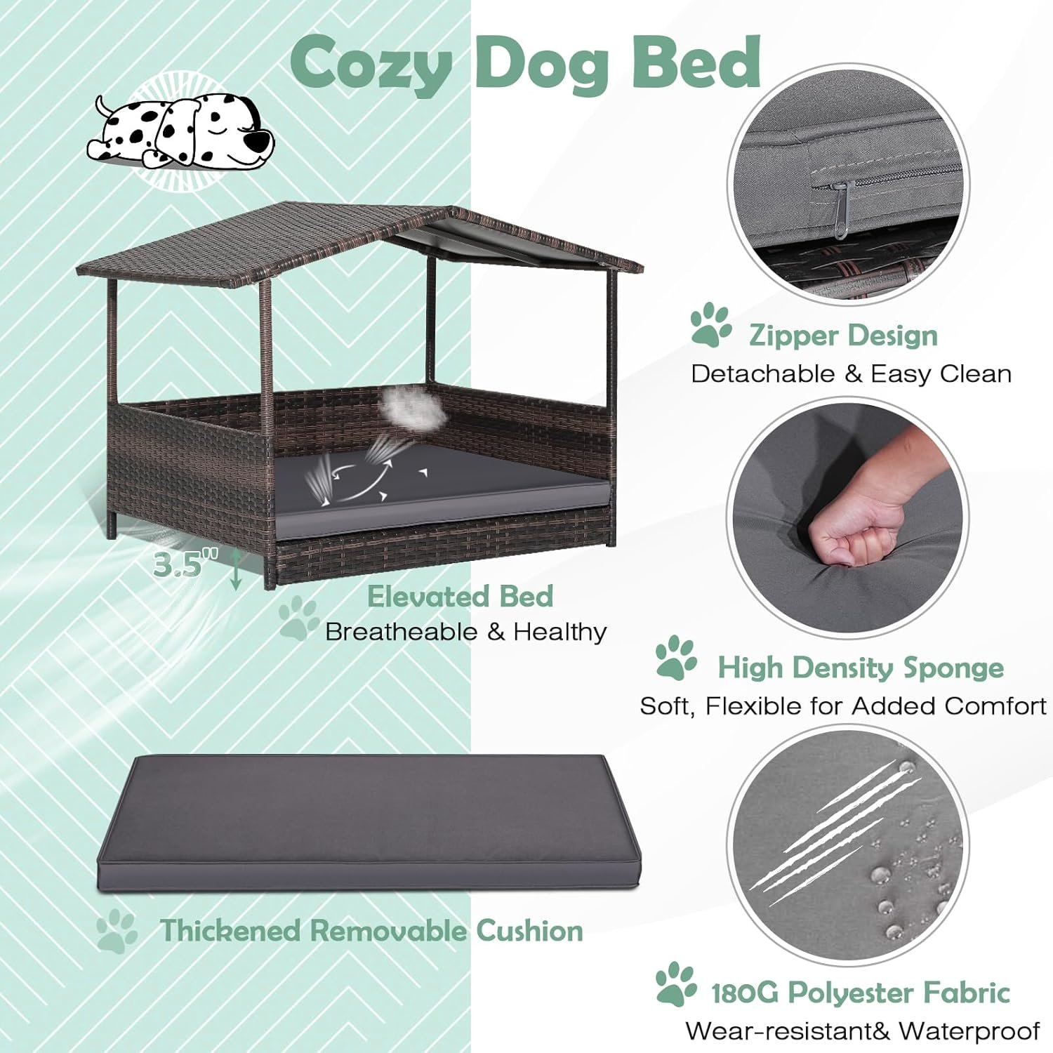 Rieten hondenbed huis, binnen buiten hdpe rattan hondenhuizen, verhoogde hondenbedje huisdier huis, verhoogde huisdieren bank met wasbare dekking, waterdichte dakopvang, verwijderbare kussen lounge
