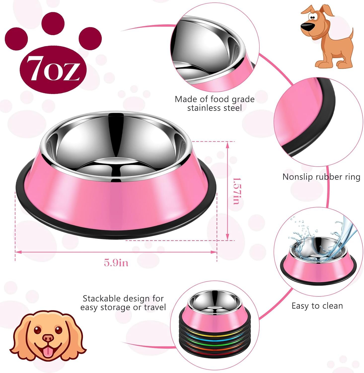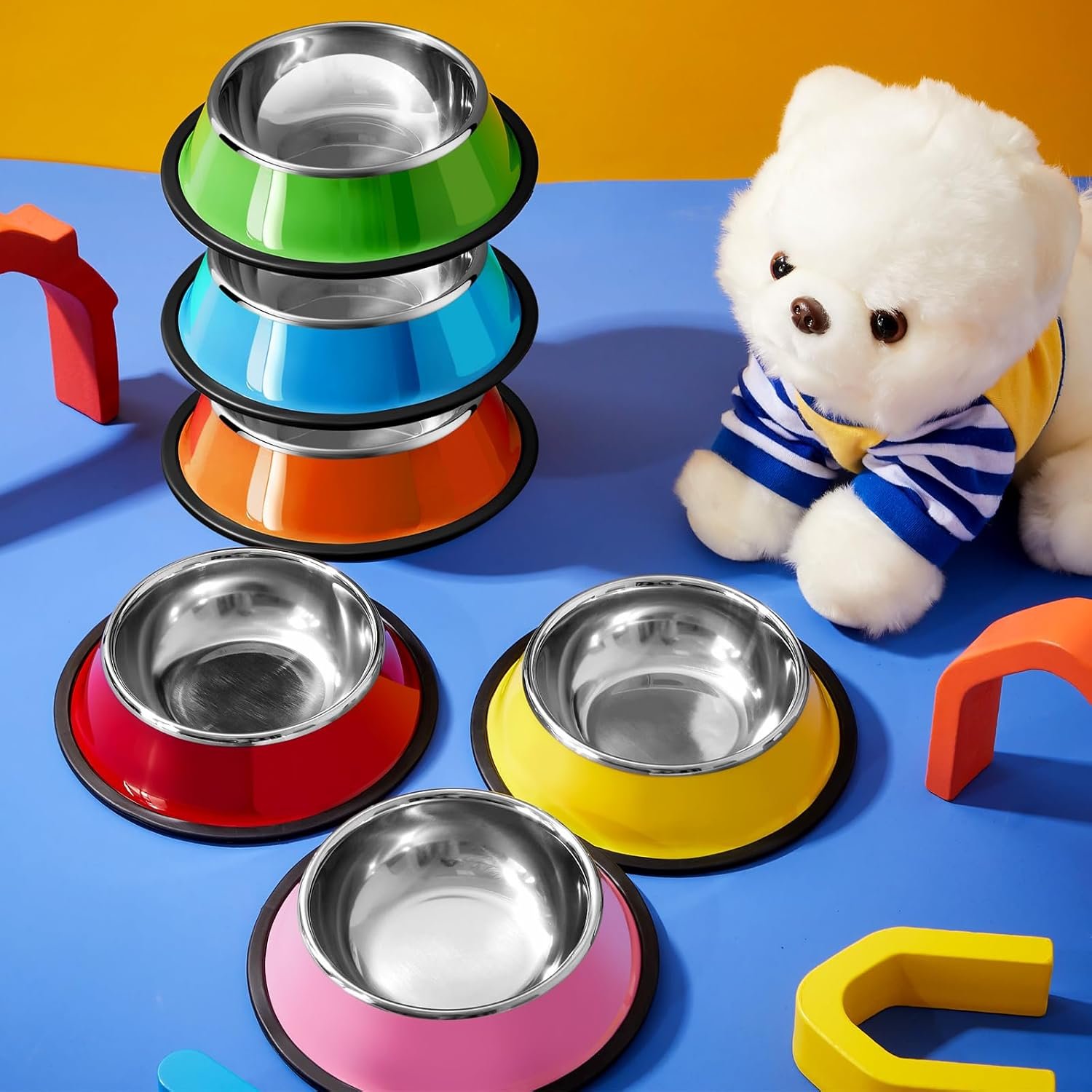 Roshtia 6 pc’s 7 oz kleurrijke roestvrijstalen hondenkom stapel water en voedselkom puppygerechten met niet -slip siliconenbasis voor middelgrote grote honden kat