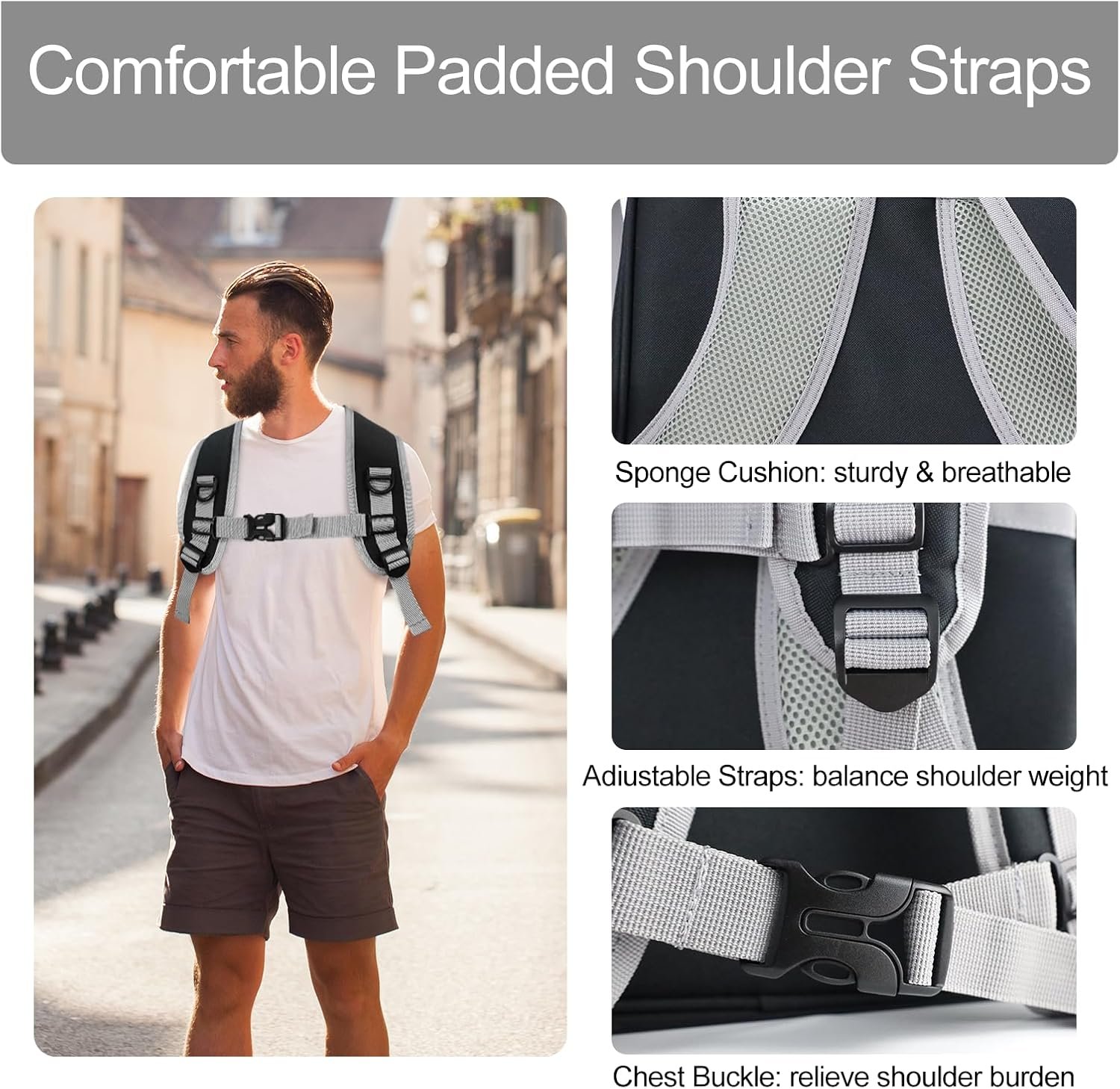 Ergonomisch ontwerp – De riemen van rugzak kunnen zweet absorberen, waarbij het ontwerp van de borstgespen de druk van je rugzak verlicht om je comfortabeler te laten voelen en te voorkomen