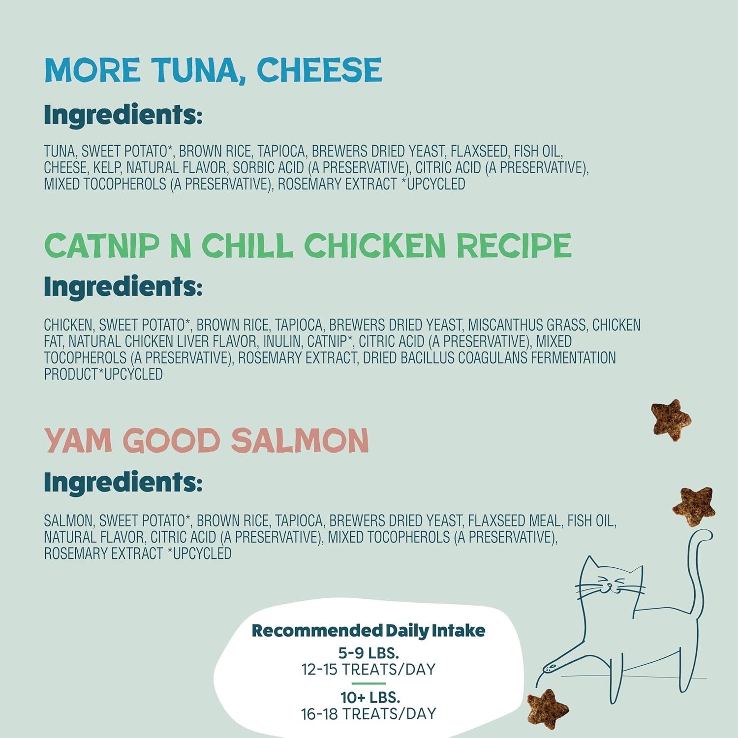 Cat -behandelingen voor spijsvertering, huid en jasondersteuning: verwen uw kat met alle opties (vooral als ze vatbaar zijn voor springen op de werkbladen en het stelen van de traktaties). Deze knapperige, stervormige, hapklare traktaties zijn gemaakt met echt vlees en upcycled zoete aardappelen. Je krijgt 2 van elke smaak, voor een totaal van 6 zakken met traktaties. Dit variëteitspakket bevat 3 smaken: Catnip N Chill, Yam Good Salmon en meer kreeft, kaas.