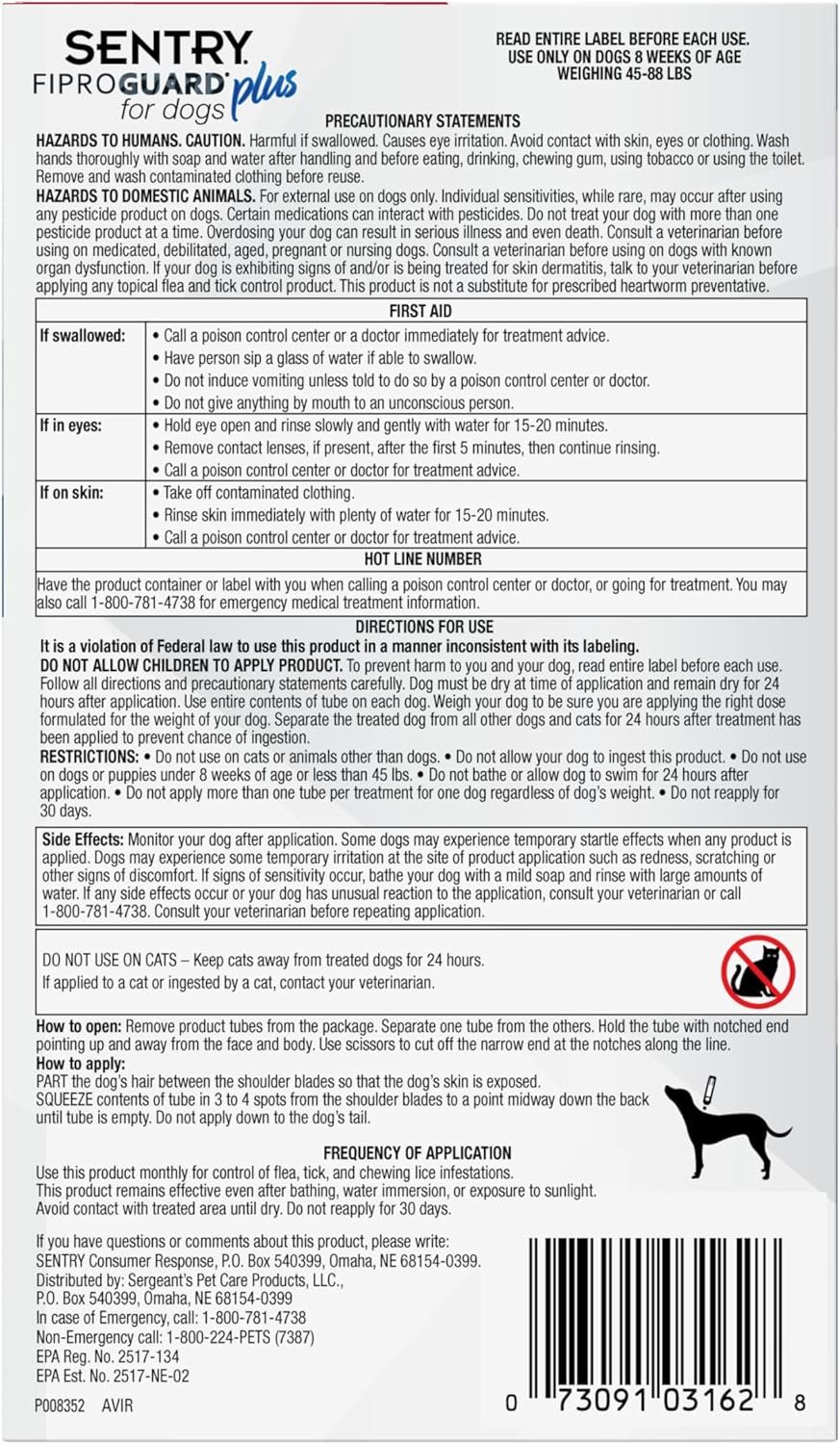Sentry Fiproguard Plus doodt vlooien, vlooieneieren, vlooienlarven, teken en kauwluizen. Sentry Fiproguard Plus is snel acteren en langdurig, Sentry Fiproguard Plus is een kneep-op om uw hond te beschermen tegen gevaarlijk ongedierte. Het breekt de vlooiencyclus van de vlooien door vlooienieren en larven te doden en doodt teken die de ziekte van Lyme kunnen overbrengen.