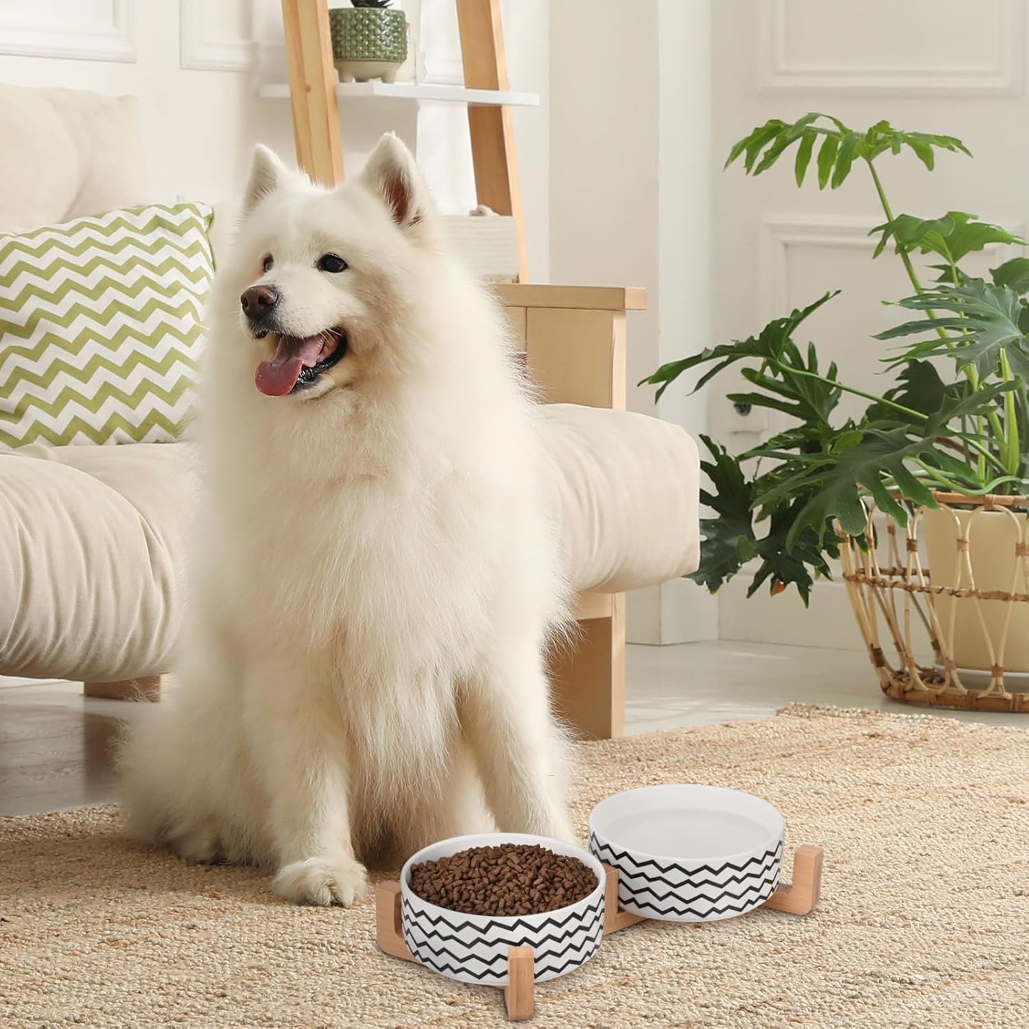 Spunkyjunky keramische hond en kattenkom ingesteld met houten standaard, moderne schattige gewogen voedselwaterkom ingesteld voor middelgrote honden (3,6 kopjes, 2 x golvend-wit)