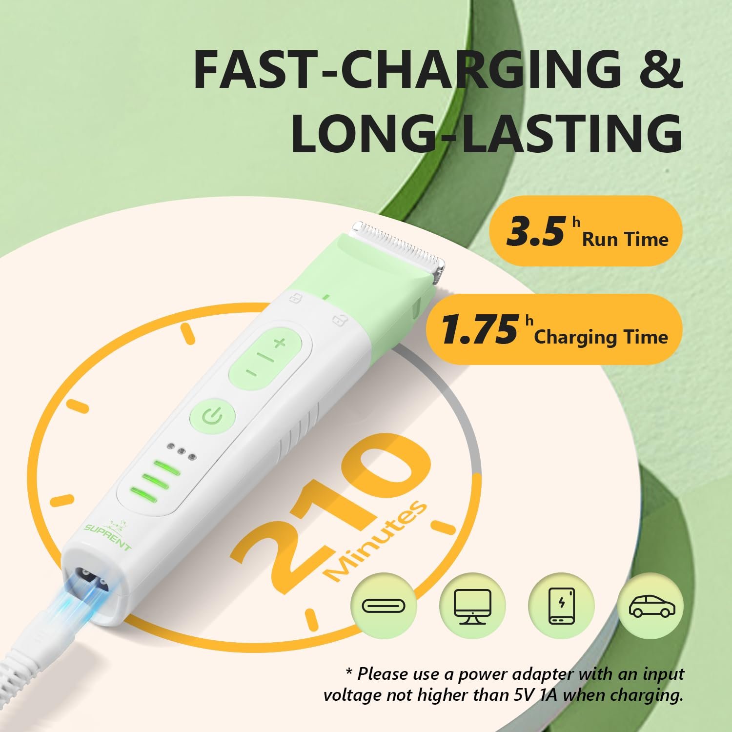 【Perfect voor beginners】 Suprent Professional Dog verzorging Clippers bieden 3 verstelbare snelheden (5500/6500/7500 tpm), zodat u de trimervaring kunt afstemmen op de geluidstolerantie en haardikte van uw huisdier. Uitgerust met 2 bijlagengeleidingskammen (3/4 & 5/6 mm) voor de haarklipper en één geleidekam (2 mm) voor de poottrimmer, hebt u volledige controle om de lengte van het haar van uw huisdier gemakkelijk aan te passen en aan te passen.