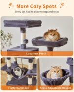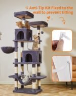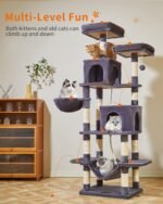 Taoqimiao Cat Tree, 71,7-inch kattentoren voor binnenkatten, pluche kattencondo op meerdere niveaus met 13 krassende palen, 2 zitstokken, 2 grotten, hangmat, 2 pompoms, rokerige grijs MS013LG