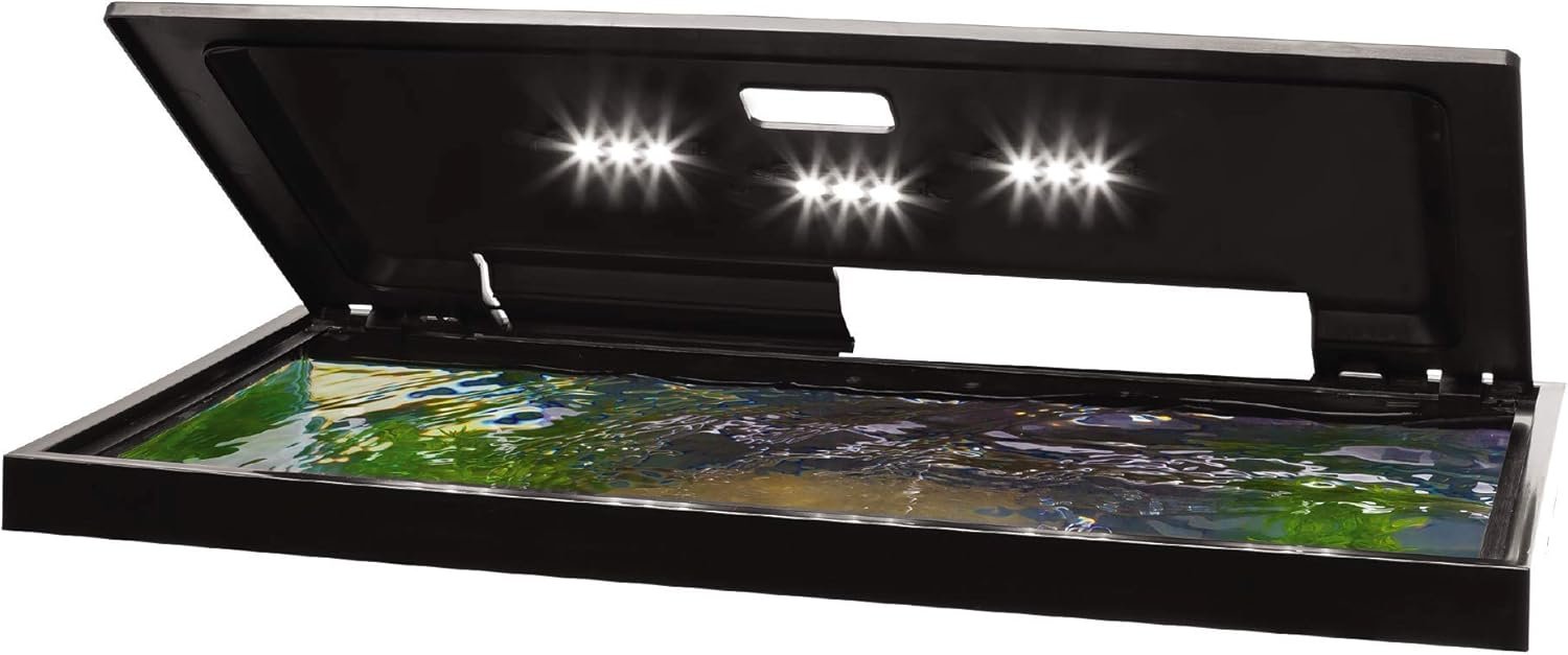 Aquariumkap met LED’s: low-profile, scharnierende kaphuizen Witte LED-lichten die een natuurlijk onderwater glanseffect creëren.