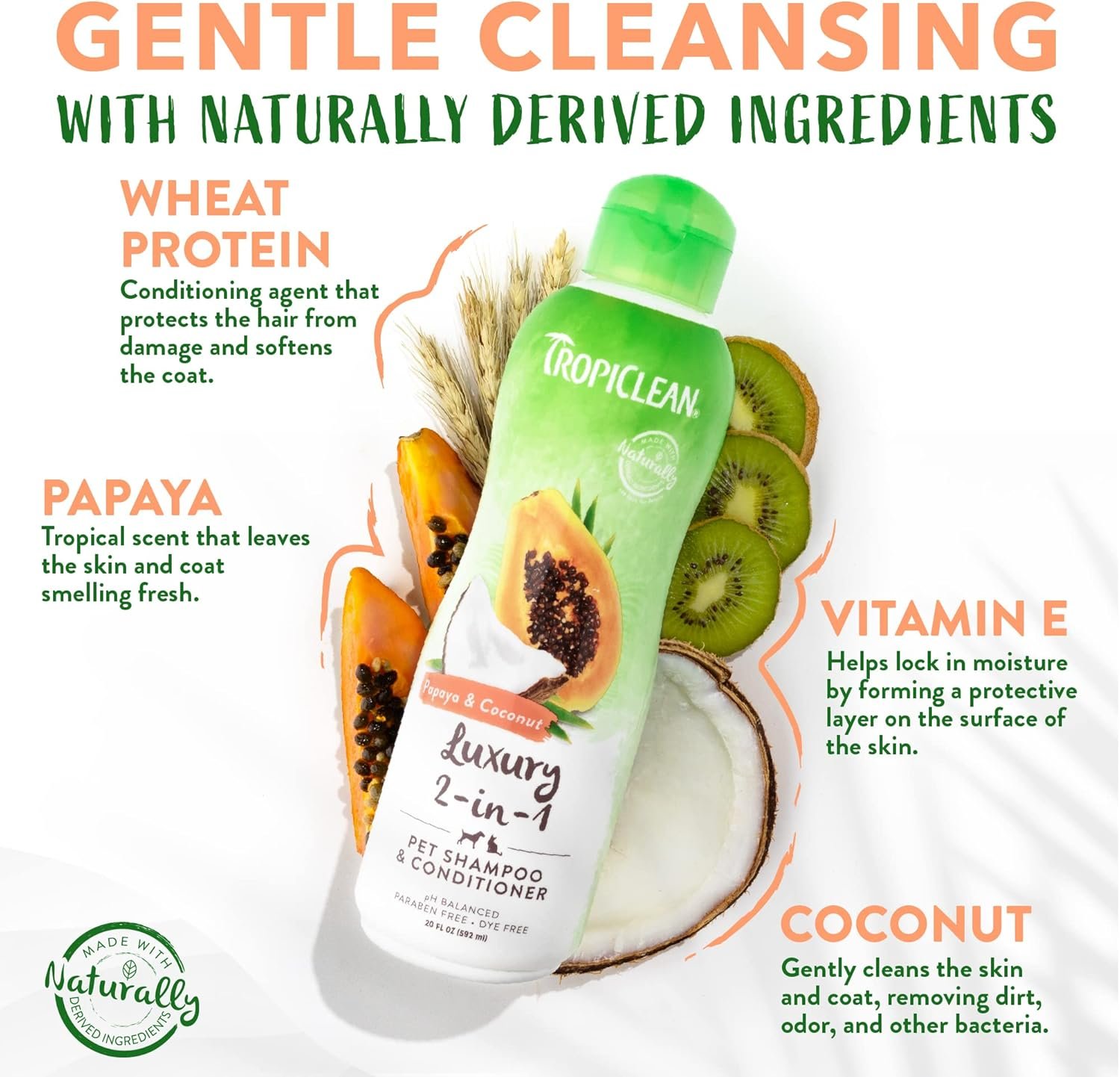 Tropiclean 2-in-1 hondenshampoo en conditioner, kat, puppy en kitten veilig, hydraterende detangler, gemaakt in de VS, papaya geur, 20 oz