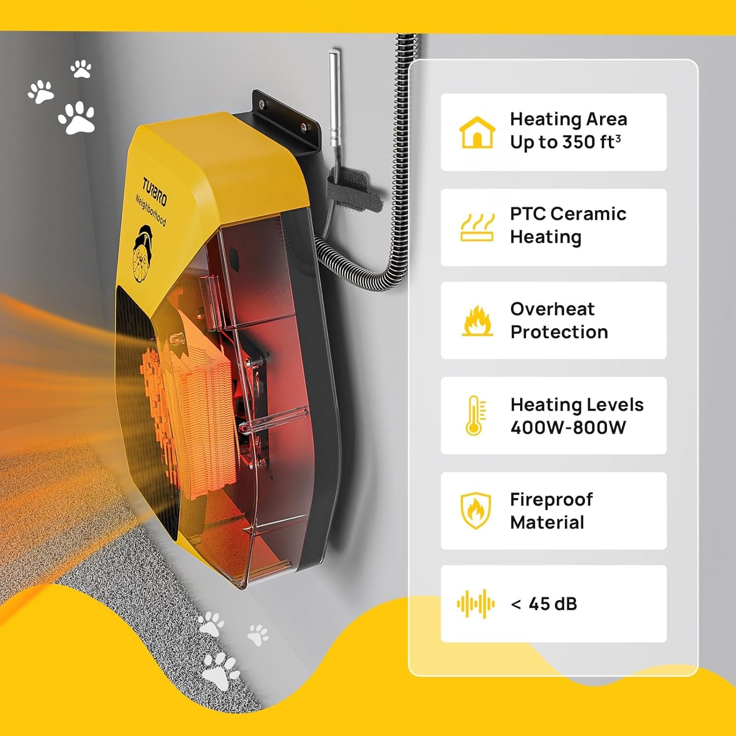 Turbro Neighborhood WiFi Dog House -verwarming 800W, wandbevestiging, 10ft Anti -bijtkoord, waterdichte controle, oververhitting bescherming, elektrische warmer voor Hound Kennel Cat Cage Chicken Coop, UL Test doorgegeven