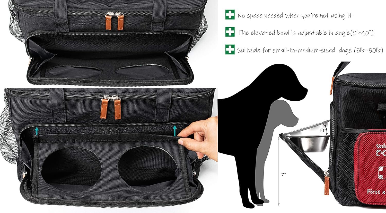 Unieke hondenreistas – Hondenreizende bagageset voor hondenaccessoires – inclusief EHBO -tag met huisdieren met case tags, verhoogde komstandaard, 2x voedselopslagcontainers, 2x honden roestvrijstalen kommen.