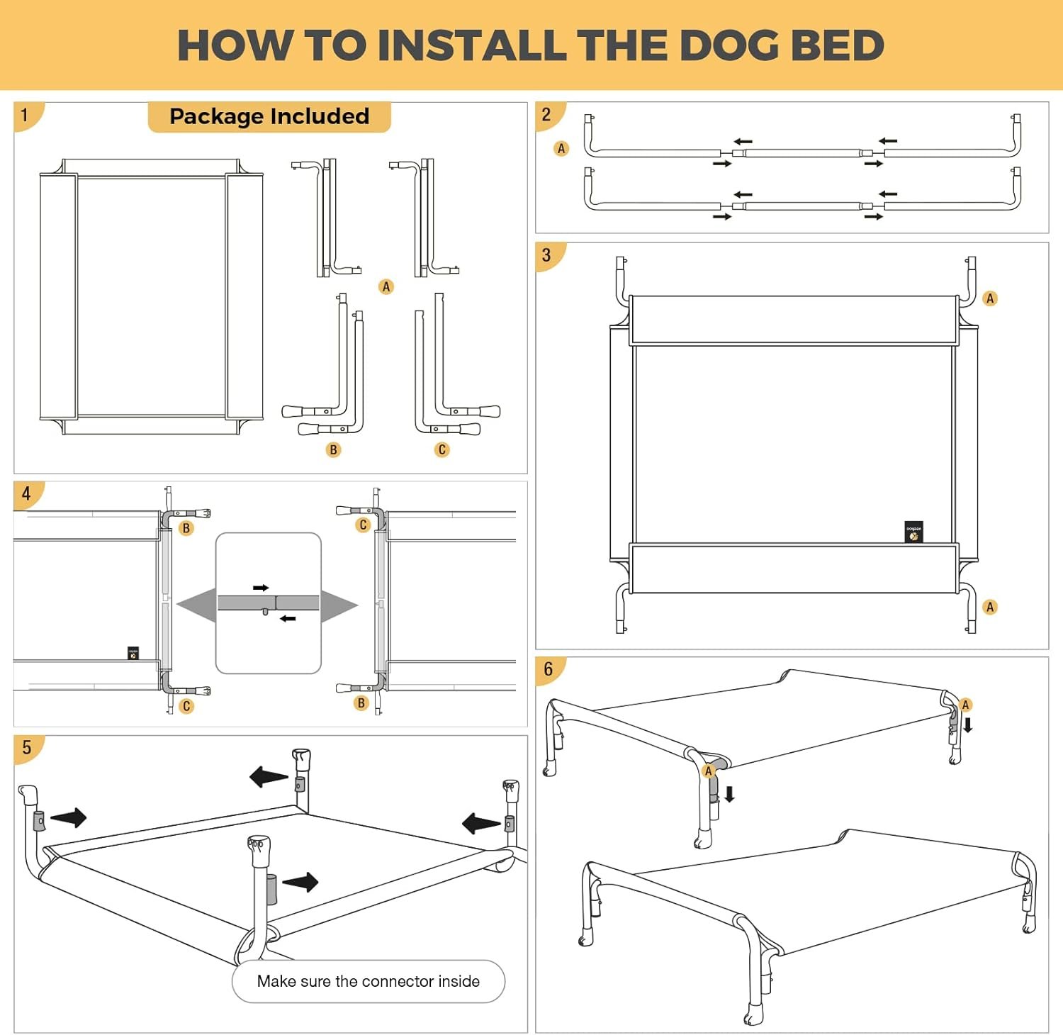 Gemakkelijk te monteren. Geen schroeven en sleutels nodig. Het hondenbed kan direct worden geïnstalleerd met het snap-on ontwerp. Beste idee als hangmatige hangmatbed- en trainingsplatform. Lichtgewicht en draagbaar. Perfect voor binnen-, buiten-, picknick, kamperen, training … Kwaliteitsslaap onderweg!