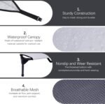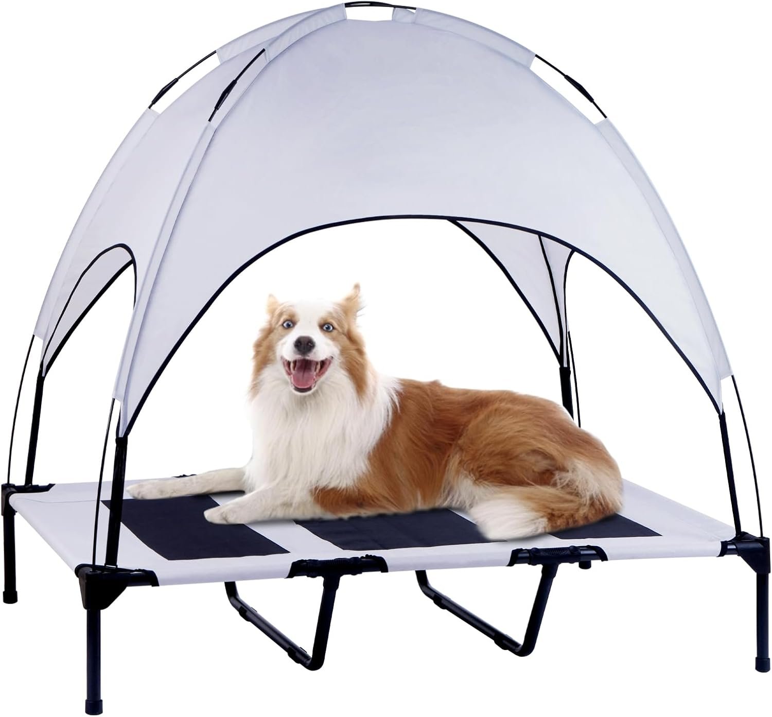 Verhoogd hondenbed: maat-47,6 “x35,4” x43.7 “(inclusief luifel). Dit buitenhondenbed wordt geleverd met een grote waterdichte en UV-resistent luifel die een uitstekende schaduw biedt in vergelijking met de meeste andere hondenbedden. Met dit product kunt u er zeker van zijn dat uw huisdier in de zomer buiten kan rusten.