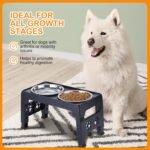 Dubbele 40 oz verdikte roestvrijstalen kommen: de grootte is 2,36 x 9 inch, 40 oz roestvrijstalen hondenvoedingskom met grote capaciteit is perfect voor het vasthouden van droge brokken, hondenvoer, water. Deze verhoogde hondenkom is afneembaar voor vaatwasserveilig