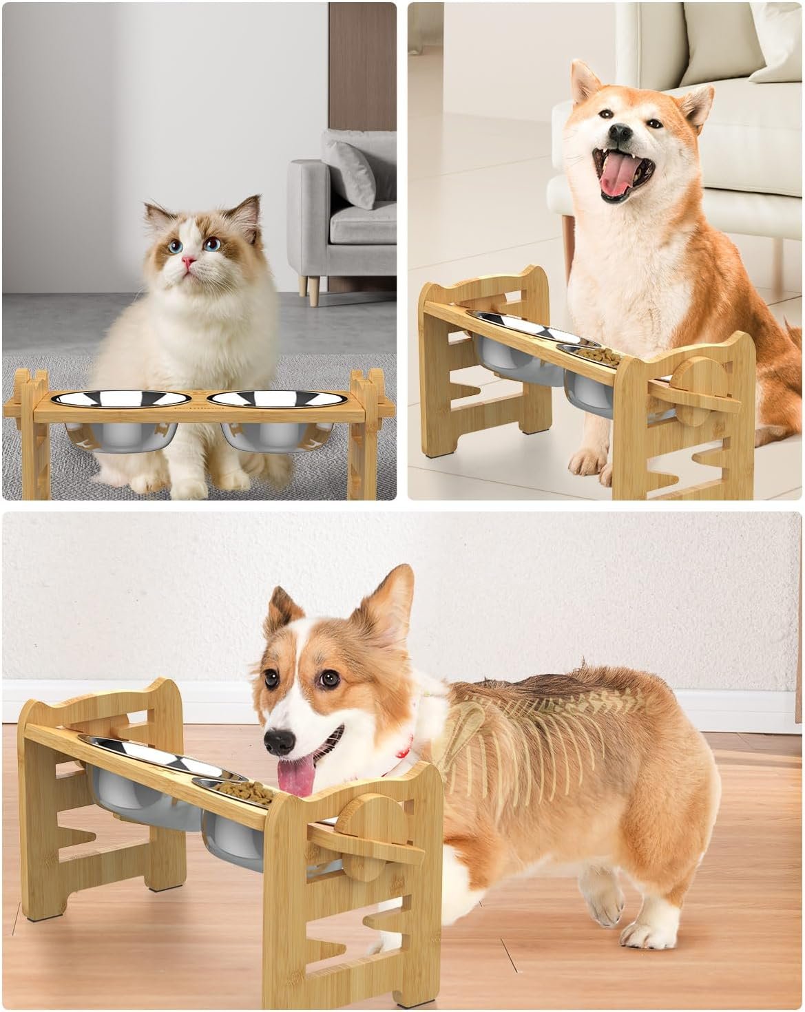Verhoogde hondenkommen, verstelbare verhoogde hondenkommen staan voor kleine honden en katten, duurzame bamboe hondenvoeder met 2 roestvrijstalen kommen en niet-slip voeten, hondenvoerkommen voor kleine hondenkatten