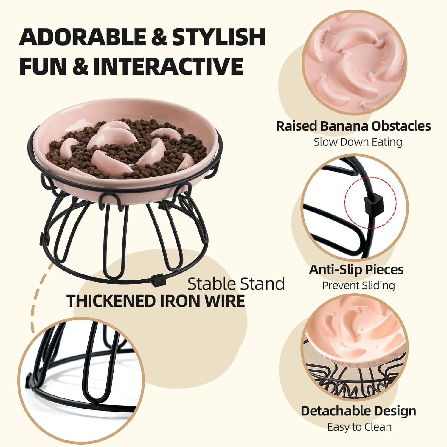 Verhoogde langzame voeder Cat Bowl – Keramische kattenvoerschotel met metaalstandaard, antislip – Pastel Series Langzame voedingsplaat – 7 oz – Lichtroze