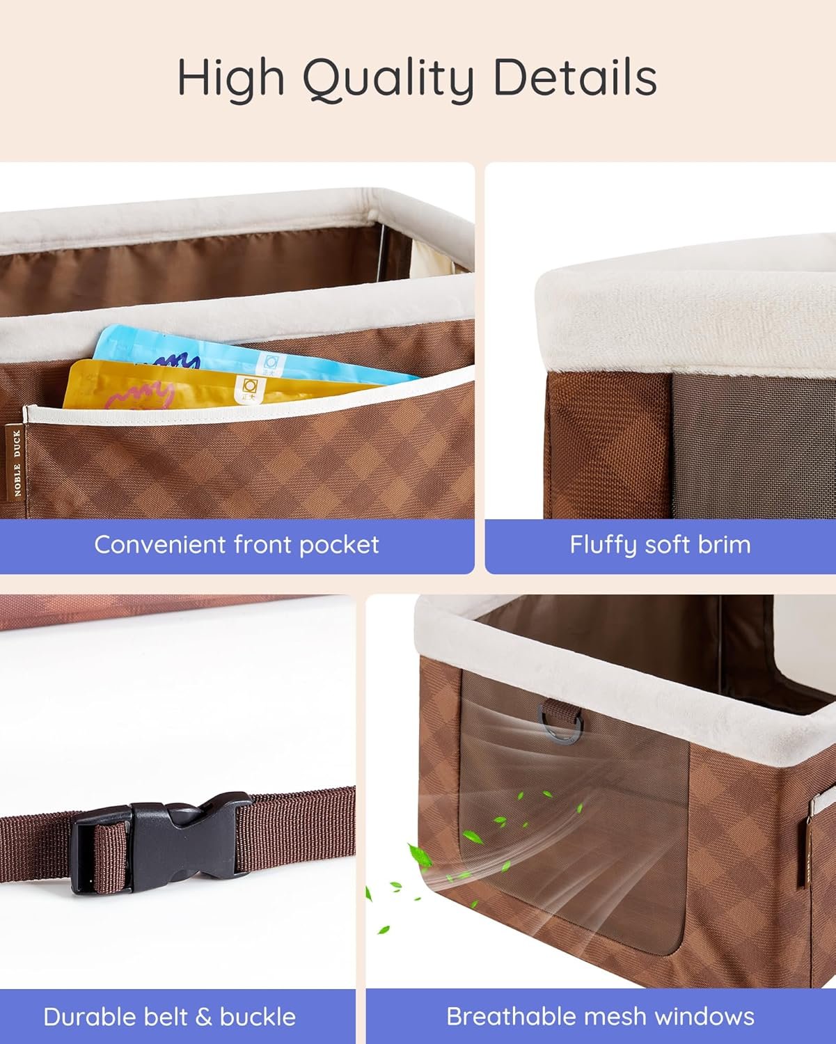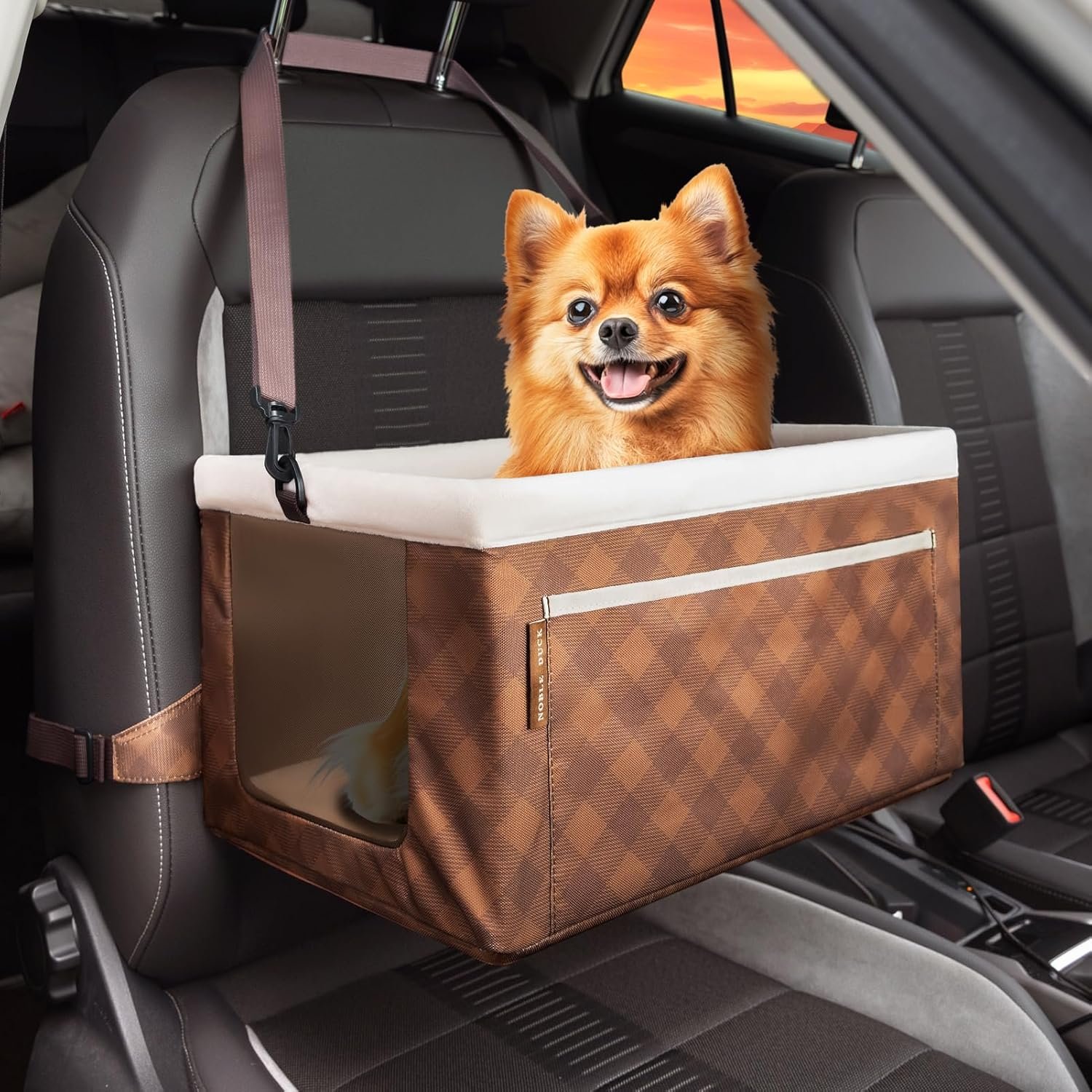 Versterk hondenstoel, verbeterde booster met stevig metalen frame voor kleine huisdieren onder de 20 pond, draagbare en ademende puppybed met opbergzakken en veiligheidsriem (bruin