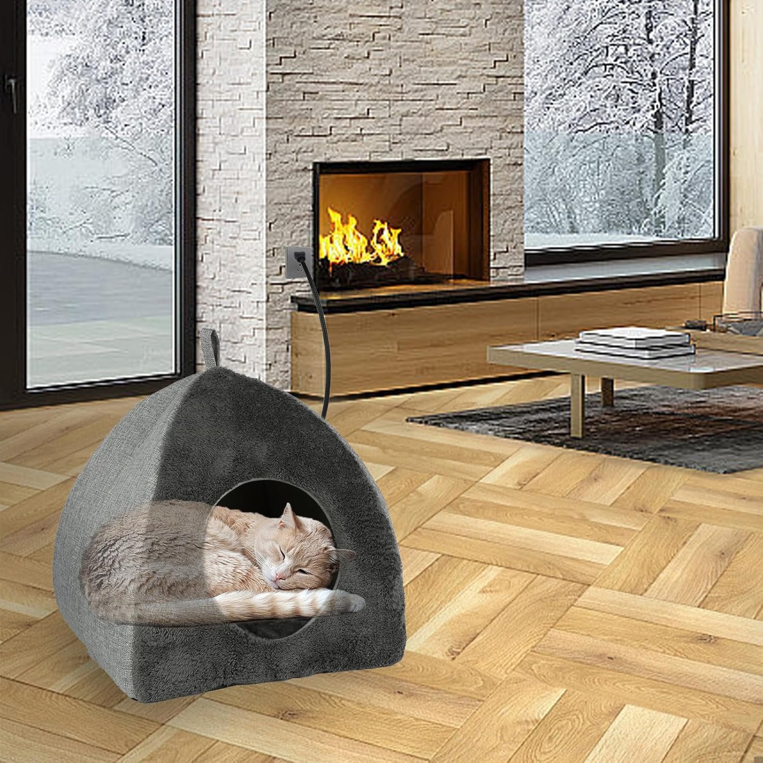 Verwarmd kattenbed voor binnen, 2 in 1 afneembare verwarmde kattenhuizen, wasbaar verwarmd huisdierhuis thermo-kitty verwarmingsbed met timer, verwarmende kattenverwarmd bed met niet-slip voor kittens en kleine huisdieren