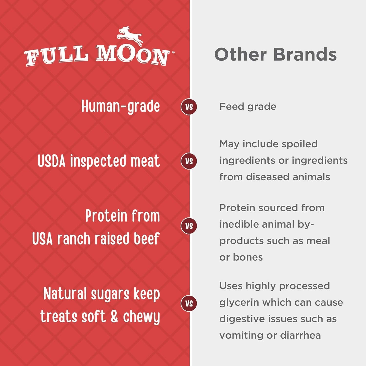 US Gegroeid rundvlees: Volle maan traktaties worden trots gemaakt in de Verenigde Staten met behulp van regionaal geproduceerde ingrediënten, waaronder USDA goedgekeurd rundvlees opgevoed op familieranches.