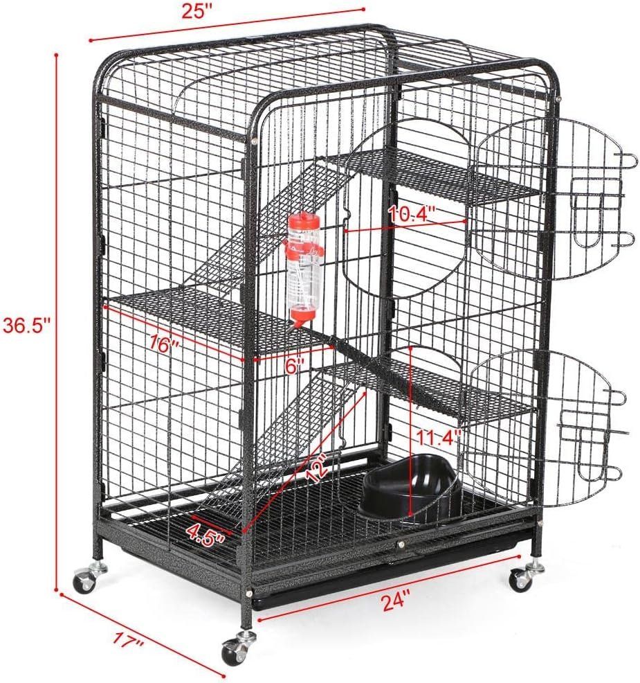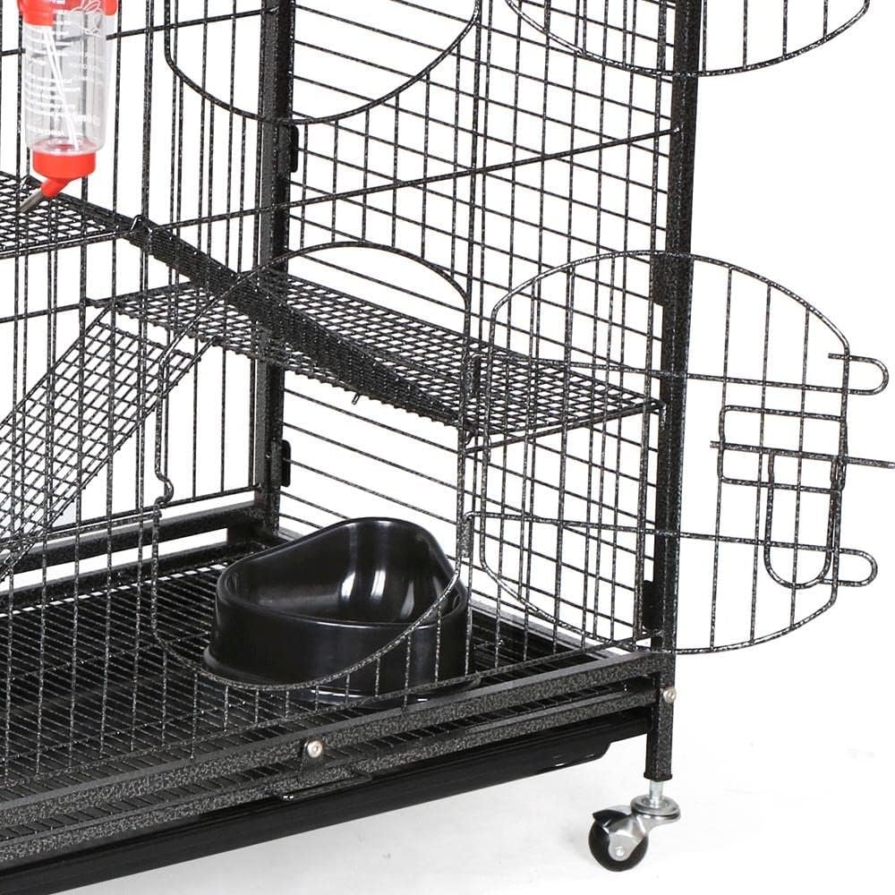 Duurzame en stevige fretkooi: deze fretkooi is geconstrueerd met de poedercoate metalen vierkante buizen en draden; Niet-giftige Hammertone-verf geeft deze stijlvolle kooi uitstekende slijtage en corrosieweerstand; Beschikt over 4 zware wielen aan de onderkant garandeert een hoge belastingcapaciteit
