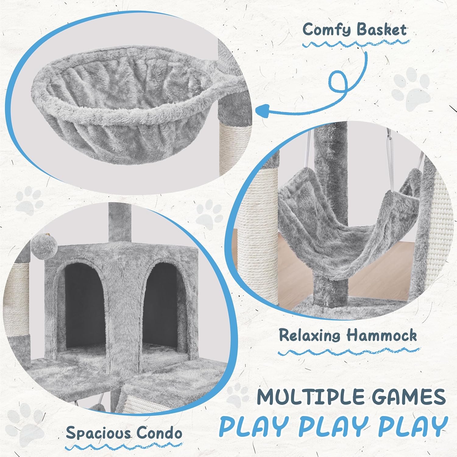 Veel plezier in veiligheid: de 19 ″ L × 19 ″ W plint en robuuste berichten bieden sterke ondersteuning en betere stabiliteit voor deze kattenboom. Het heeft een veiligheidsriem om te voorkomen dat schade intensief springt en springt door de kattenboom tegen de muur te beveiligen