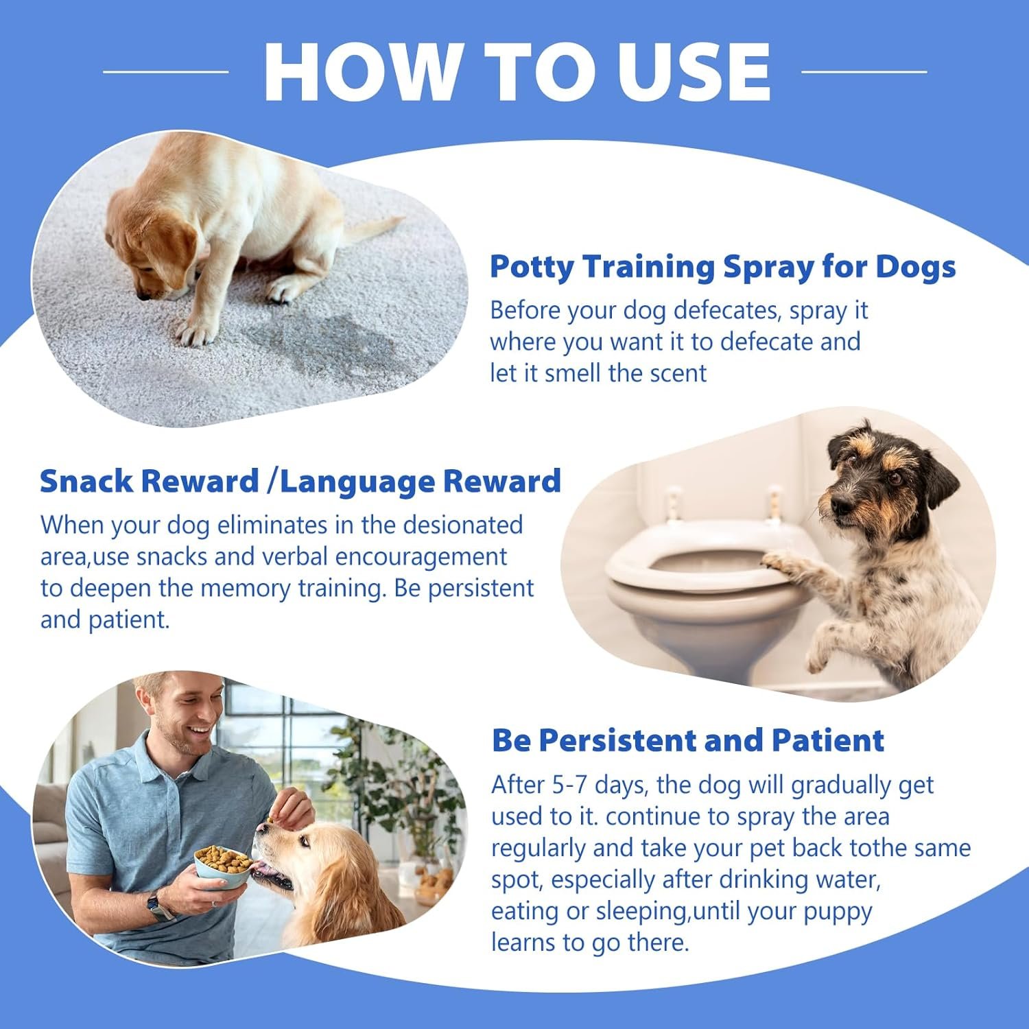 Gemakkelijk te gebruiken – spuit het gewoon waar de hond moet poepen, en het zal je harige vriend aantrekken om op deze plek te poepen. Met voortdurend gebruik, lof en veel aanmoediging en liefde, zal je geliefde hond zeker leren binnenkort binnenshuis te poepen.