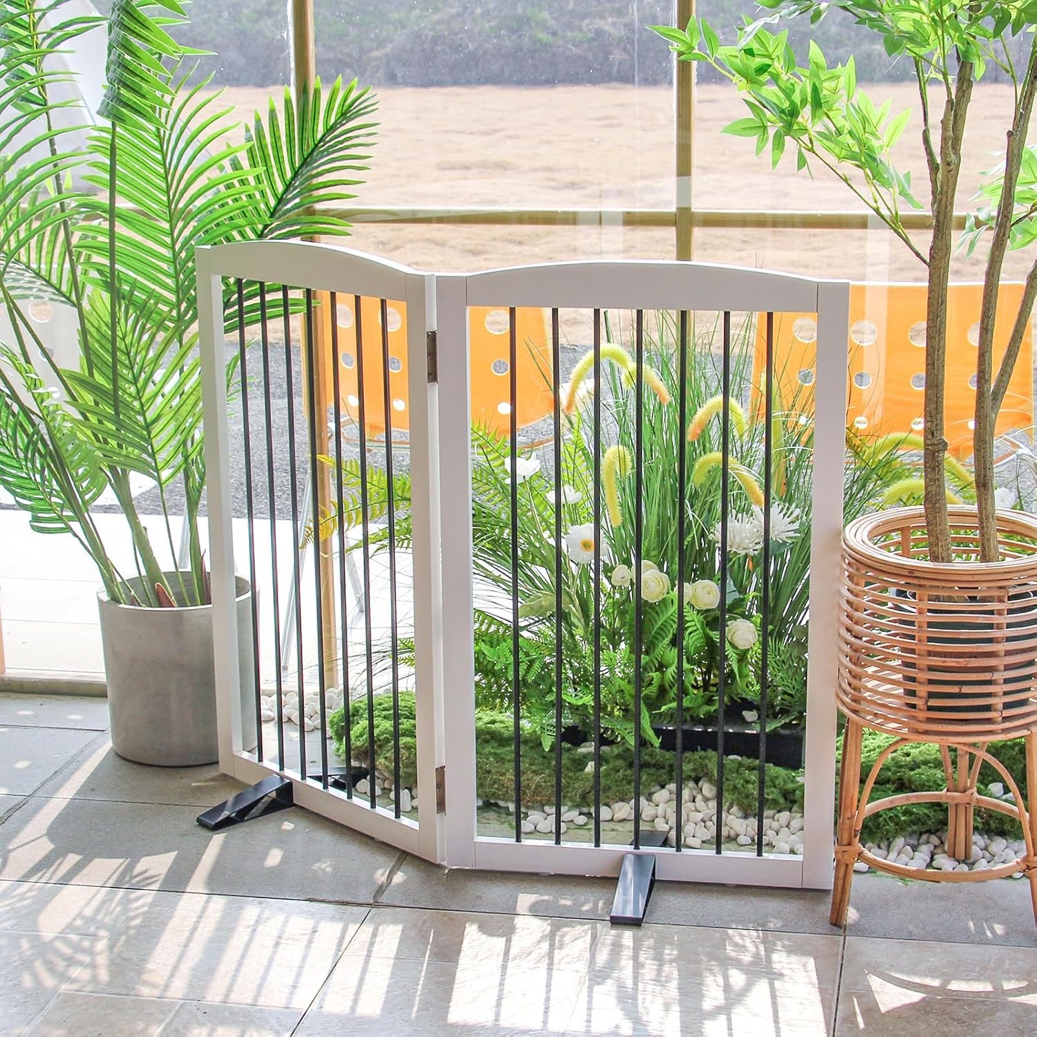 【Eenvoudig en stevig】 Deze converteerbare paneelhondenpoort is een hondenhek, indoorverdeler en huisdierpen allemaal in één. Combinatie van houtstaven voor hout en geëlektropleerde. Niet-slip rubberen voeten om uw vloer te beschermen.